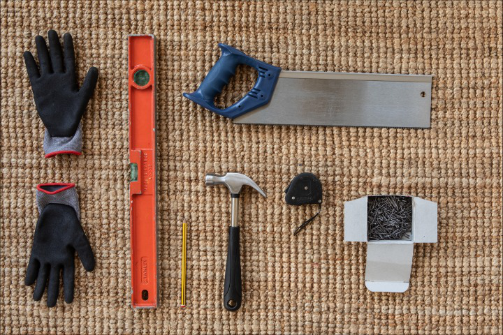 Martillo, Nivel (si no tienes puedes instalarte una app en tu móvil), Sierra, Metro y Lápiz.